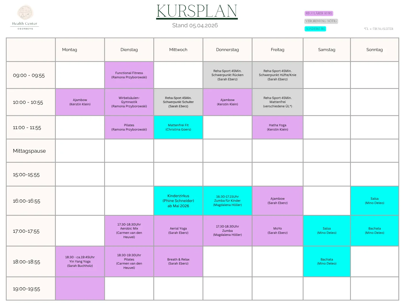 Im Health Center Oberberg bieten wir eine breite Palette an Kursen, die auf die Bedürfnisse und Interessen unserer Teilnehmer zugeschnitten sind.
